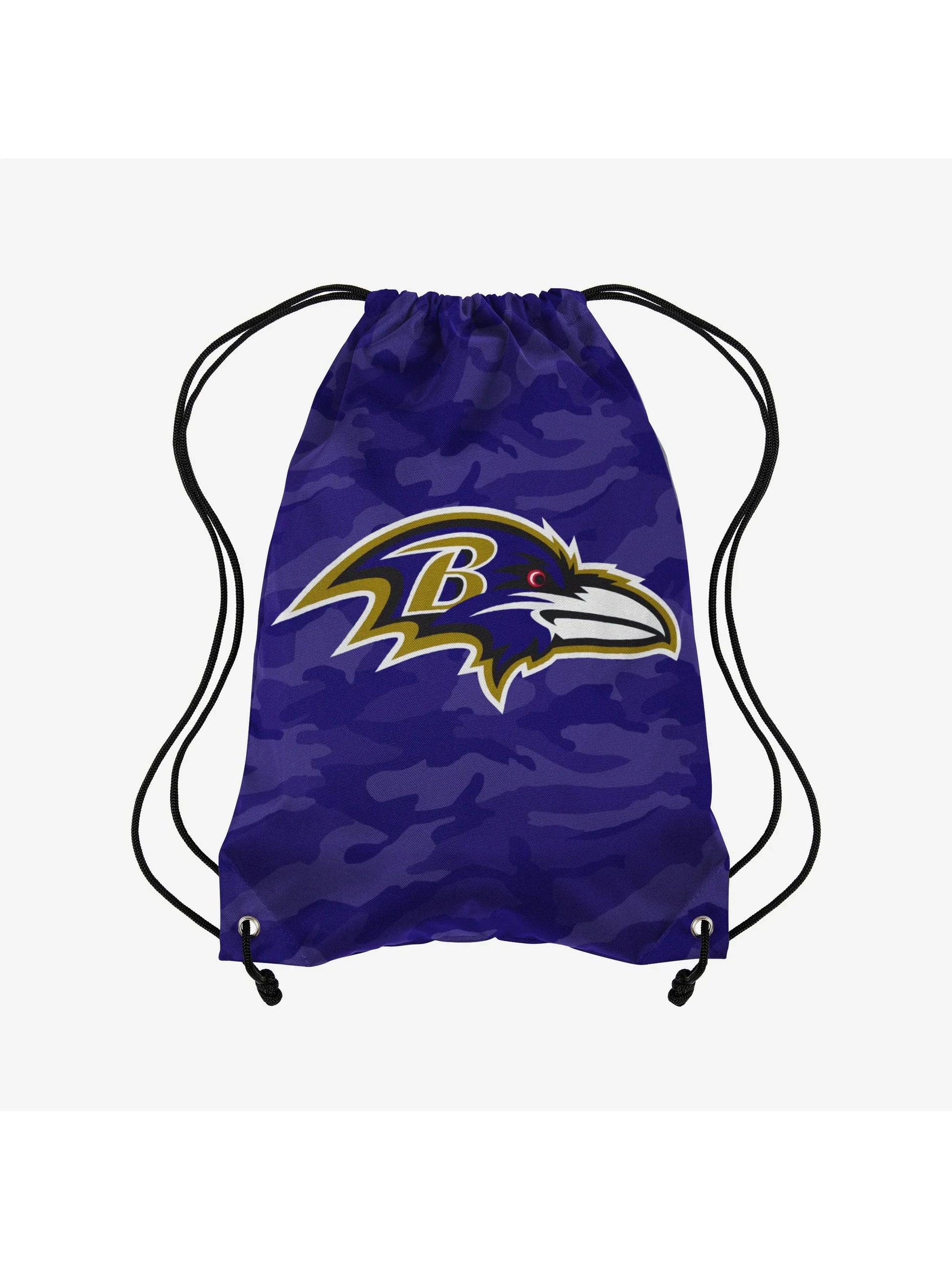 Keep calm. Carry on. Carry your stuff and stand out with this Baltimore Ravens Big Logo Camo Drawstring Backpack!