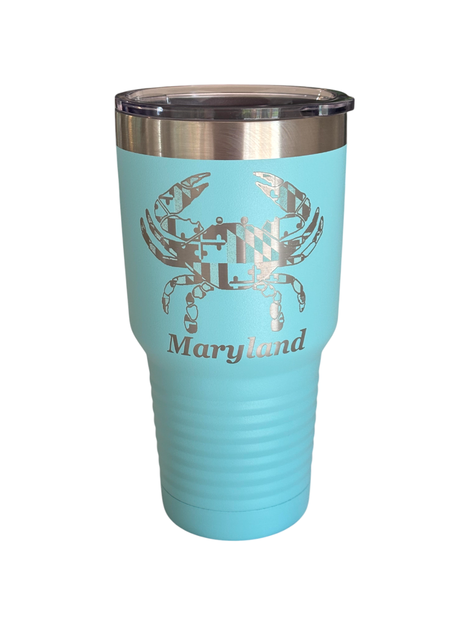 Stylish insulated tumbler with a light blue finish, featuring the iconic Maryland flag crab design. Keeps drinks hot or cold while showing your coastal state pride.