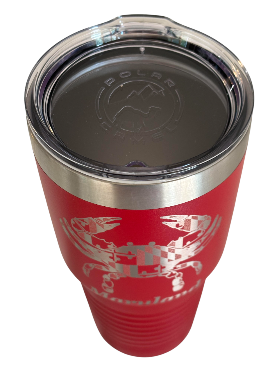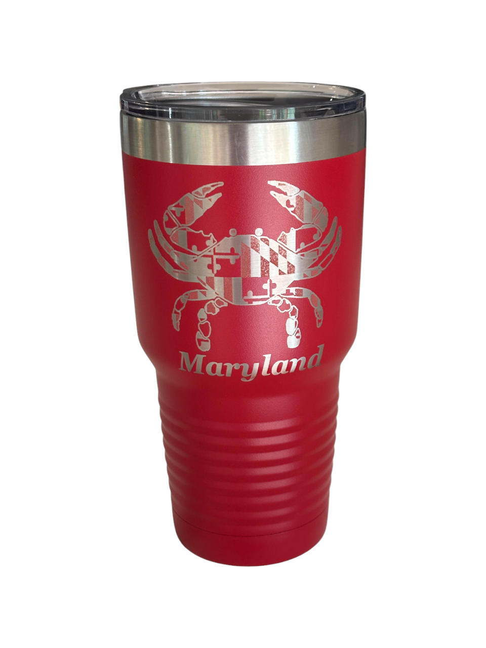 Bold insulated tumbler in vibrant red, featuring the iconic Maryland flag crab design. Perfect for keeping drinks hot or cold while showing your Maryland pride.