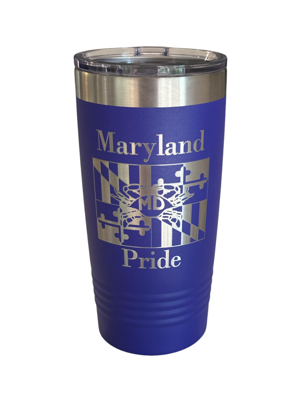 Eye-catching insulated tumbler in rich purple, featuring the bold Maryland state flag design. Keeps drinks hot or cold while showcasing your Maryland pride.