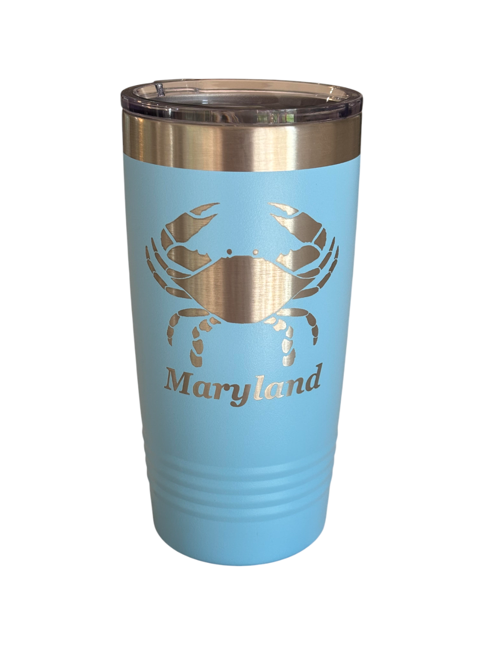 Durable insulated tumbler in light blue, featuring a colorful Maryland crab design. Perfect for keeping drinks hot or cold while celebrating Maryland’s coastal charm.