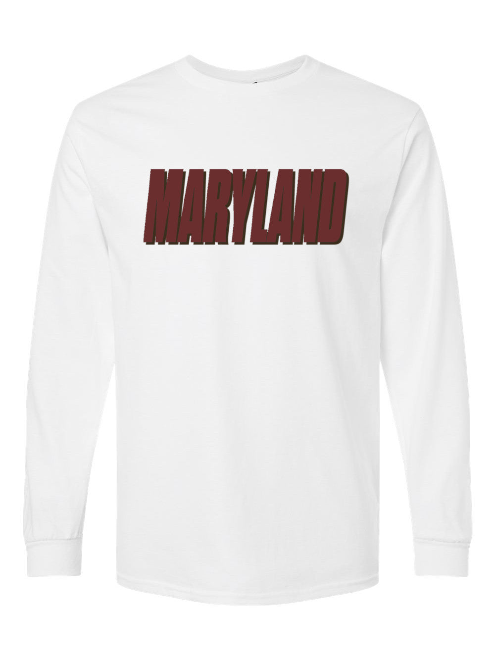 Celebrate Maryland pride with this Retro Text Long Sleeve Shirt in crisp white. Featuring vintage-inspired "MARYLAND" lettering, this long sleeve tee offers a classic and stylish look perfect for any season. Crafted from high-quality, soft fabric, it ensures comfort and durability for everyday wear. Whether you're cheering on your state, exploring local landmarks, or looking for the perfect gift for a Maryland fan, this shirt is a versatile and timeless addition to any wardrobe. Show off your state spirit in retro style!